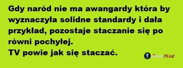 W Polsce nie istnieje wspólnota, nie istnieje społeczeństwo obywatelskie, a standardy są tragicznie niskie. Wspólnoty nie buduje się w rok, świadomego obywatela nie wychowa się w miesiąc. Polscy mądrale mieli 36 lat na to i nie uczynili NIC. Niedorozwój intelektualny polskiej inteligencji jest znaczny i postępuje, nic z tego dziwacznego bantustanu nie będzie i to nie z powodu "ludu" który głupi jest bo taka jego natura. Polska inteligencja 36 lat pokazuje że jest bezwartościowa jako awangarda, mało inteligentna, zarozumiała i słabo komunikatywna.